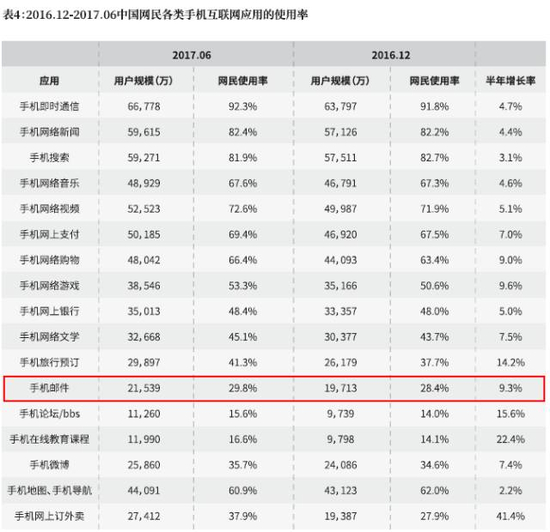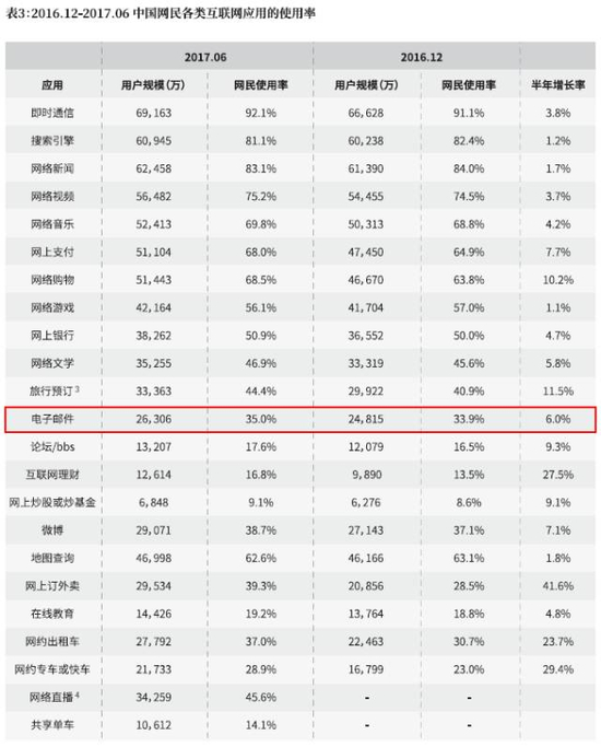 根据2017年8月4日CNNIC发布的《第40次中国互联网络发展状况统计报告》数据显示,在个人应用方面,中国网民各类互联网应用的使用中,电子邮件的用户规模和使用率仍然保持了继续增长。2017年6月末的电子邮件用户规模约为2.6亿,使用率为35%。其中,手机邮件的用户规模约为2.15亿,使用率为29.8%。