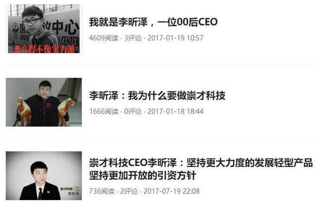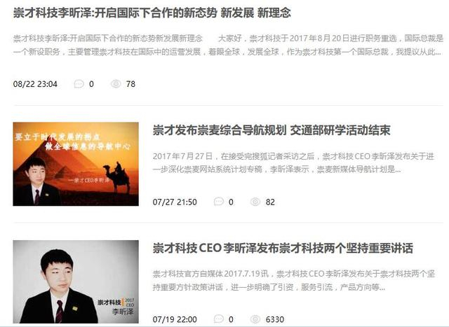 崇才科技自媒体介绍的内容,多是CEO李昕泽参加XX活动,或发布XX重要讲话,等等之类。嗯哼,你没看错我也没写错,确实如此的怪诞好玩。