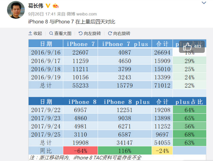当然如果要看数据的话,中国移动浙江公司市场经营部@葛长伟在微博上公布了一组数字:浙江移动在iPhone 8系列上市四天后统计到的数据显示,iPhone8与iPhone8 plus在上市四天后的录得的销量数据分别是19908台与34147台的销量,共计54055台。而对比去年iPhone的上市4天销量数据分别是55233台与71012台。对比iPhone7上市4天的销量数据,iPhone8系列的整体数据同比下跌24%。