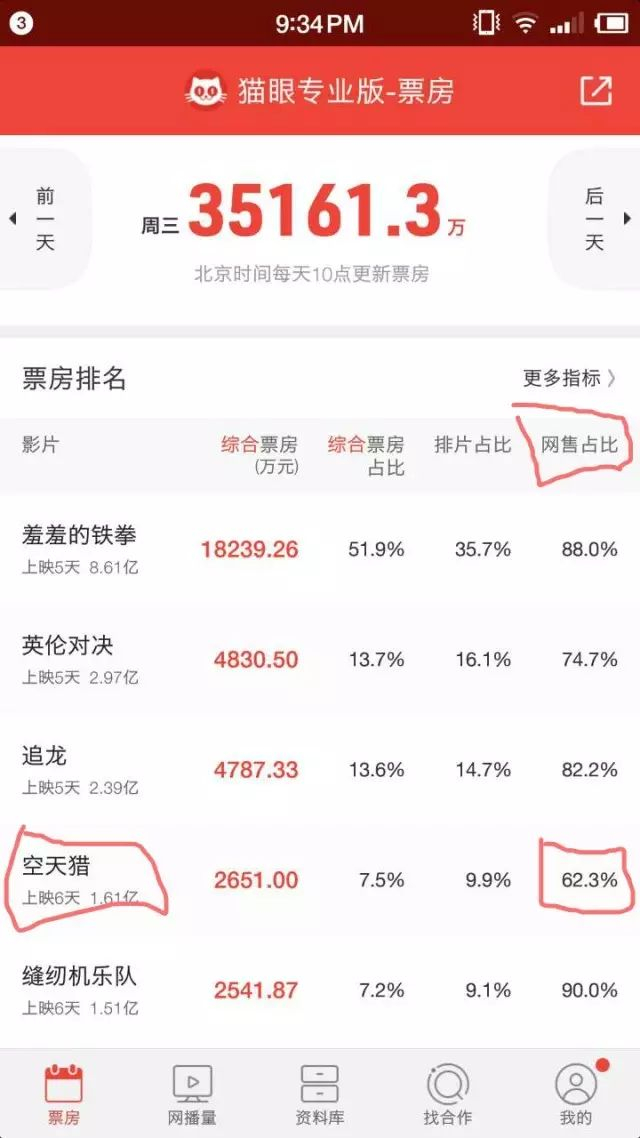 某种程度上,用这种方法即可粗略计算出其在这家院线不正常的票房数据来,例如《空天猎》昨日在万达院线的非正常场均人次为46人(68-22=46),其影片在万达院线的昨日单日票房为413万,非正常数据大约为279万(413*46%68)。当然这只是一个相当粗略的数字。