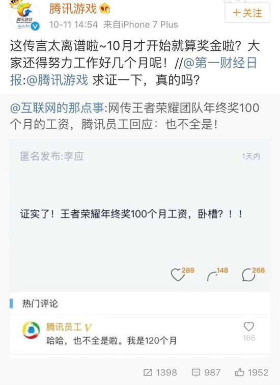 随后,腾讯游戏官方微博出面辟谣称:“这传言太离谱啦~10月才开始就算奖金啦?大家还得努力工作好几个月呢!”尽管官微出面打破传闻,但网友心中却自有其想,毕竟早在去年,全年收入68亿的《王者荣耀》一举夺得MOBA手游霸主之位,腾讯互娱也霸气拿出约1亿人民币奖金犒赏员工,王者荣耀项目组人均分得140万元,最低分红60万元,核心员工更是最多分到了290万元人民币。彼时《王者荣耀》日活跃用户数4000余万,而截至今年5月,这个数字已经达到了5412.8万。100个月工资并不是无稽之谈。