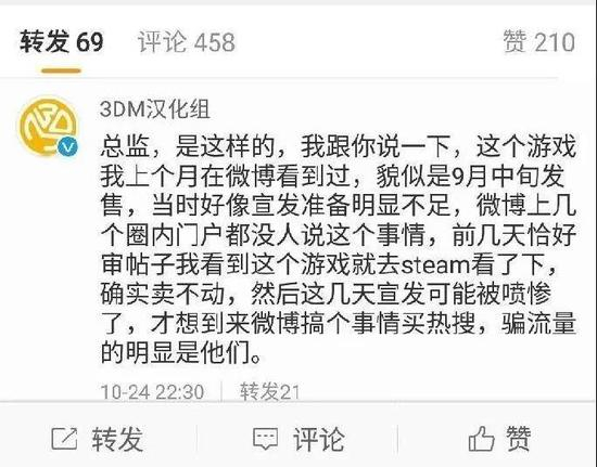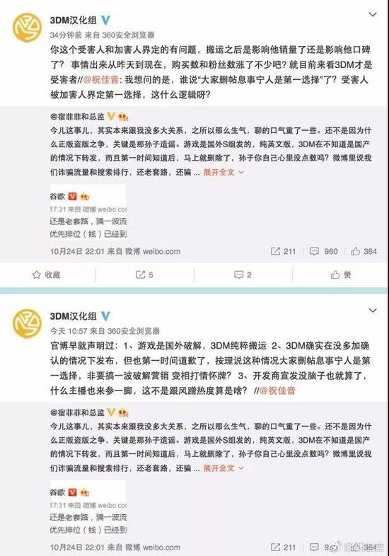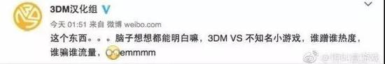 看上去也就到此为止了,不过接下来发生的事情就比较好玩了,这个时候,一个叫做“3DM汉化组”的蓝V认证微博加入了战场,开始火力全开。