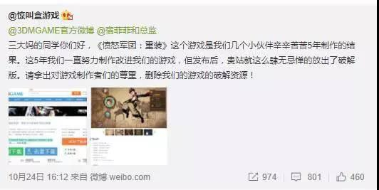 10月24日,国产STG《愤怒军团》的开发商惊叫盒游戏发布了一条微博,控诉3DM发布了《愤怒军团》的破解版,并要求对方下架删除盗版资源。