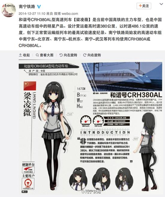 早在2014年南广高铁开通时,南宁铁路局就率先尝试与知名同人社团北方铁道萌化部合作,将其所创作的《天朝铁道少女》中出现的诸多动车组拟人形象引入了开通仪式。