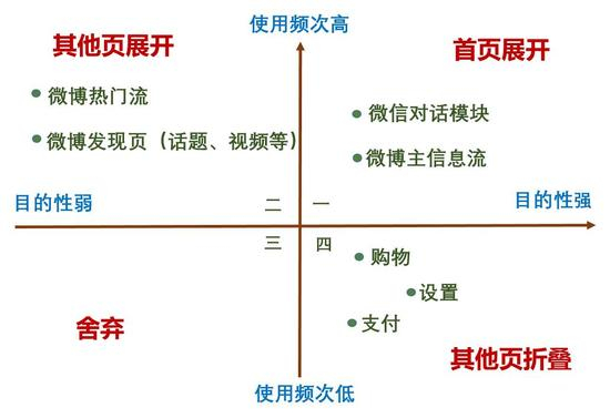 这时候我们就会发现两个应用有一个明显的共同点和一个明显的差异:共同点是对于第一象限“频次高、目的性强”的功能,两个应用不约而同地放到了首页,如微信的对话、微博的主信息流。