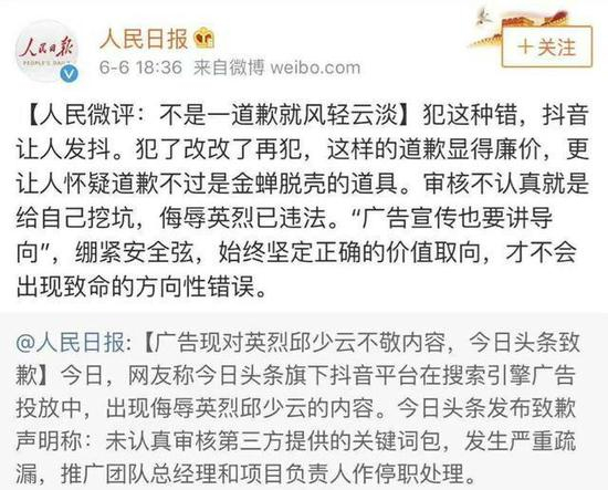 人民日报的微评《不是一道歉就风轻云淡》可能也秉持同样的态度,“犯这种错,抖音让人发抖。犯了改改了再犯,这样的道歉显得廉价,更让人怀疑道歉不过是金蝉脱壳的道具。审核不认真就是给自己挖坑,侮辱英烈已违法。广告宣传也要讲导向,绷紧安全弦,始终坚定正确的价值取向,才不会出现致命的方向性错误。”