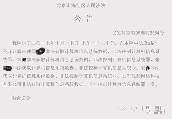 10月14日,海淀区人民法院的开庭公告揭开了谜底:两人涉嫌非法获取计算机信息系统数据、非法控制计算机信息系统罪,将在10月17日开庭审理。