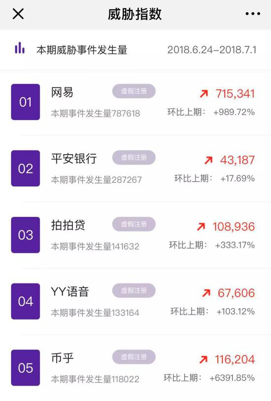 “网易邮箱的虚假注册,在威胁指数中排到了第一。”紫豹神探局的相关负责人称,“除此之外,平安银行、拍拍贷、YY语音和币乎,也存在大量的虚假注册”。