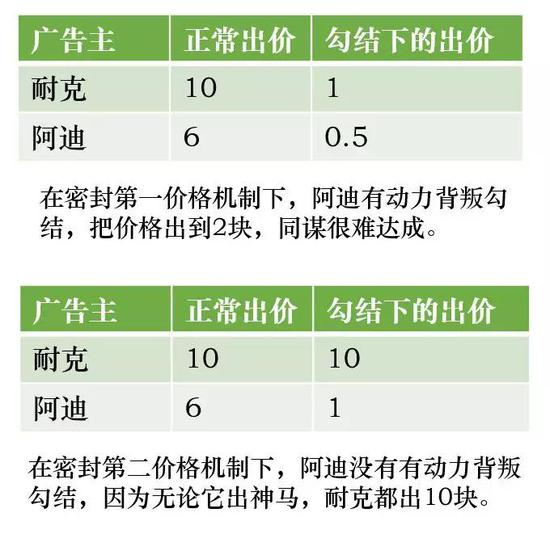 依然拿耐克阿迪来打比喻,耐克的心理出价是10块,阿迪是6块,这时候他们勾结,阿迪出1块,耐克出10块,最终耐克只需要花1块钱就能买走这个广告位,受伤的是广告平台。聪明的人立马会说——难道“第一密封价格”不会出现这种情况吗?比如耐克和阿迪商量好,耐克出1块,阿迪出0.5元,还是耐克以1块钱的价格买走这个广告位啊!