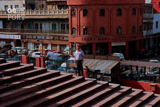 一栋三层的黄色建筑出现在眼前,墙面涂料大片剥落,露出底下的黑色材料。商户门窗紧闭,大幅的广告牌上随处可以见涂鸦,一幅广告牌歪斜,摇摇欲坠。门厅的走廊上,有印度街头常见的体型瘦长的野狗穿过。一个裁缝在院子里架起缝纫机,咯吱咯吱地踩着,他的妻子于一旁帮忙裁剪,他们是这个市场上仅见的商人。