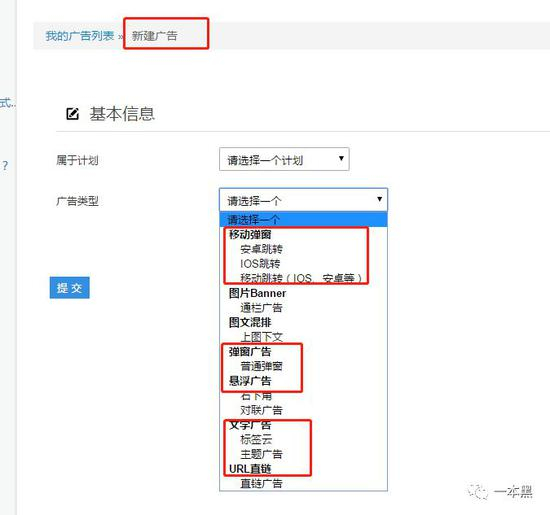在广告列表里,每一个新建的广告是可以选择所投放广告的类型的。