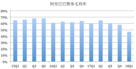 换个角度也能印证这点。阿里今年一季度的整体毛利率是47%,去年四季度是58%,均低于它的平均水平。这正是阿里大举布局线下的阶段,高投入拉低了毛利率。财报对此解读为,源于对新零售、菜鸟、Lazada的投入,以及为扩大用户基数、改善用户体验所做的支出。