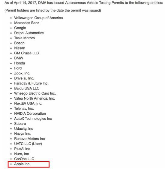 2017年4月,加州的机动车管理局(DMV)批准苹果在公共道路上测试自动驾驶汽车。以下是在加州测试自动驾驶汽车的公司名单: