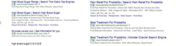 谷歌上对于具体的疾病关键词比如高血糖、前列腺等等都存在少量的广告内容,比如搜索“high blood sugar”或“prostatitis medicine”时会有相应的广告出现,但总体上不算多,类似于前面的城市医院广告,有时搜出来的不带有关键词,属于模糊匹配。