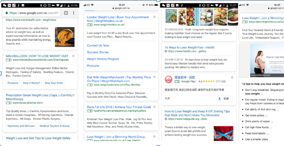 但相比医院、疾病、科室和整形的广告,谷歌的减肥广告数量却非常之多,甚至可以说中国的搜索引擎都不一定有这么多减肥广告。