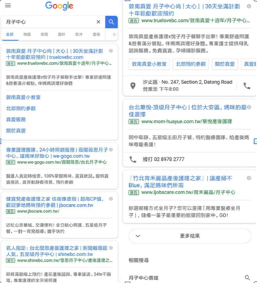 联想到此前今日头条在不同地域展示不同的广告,最终偷偷在三四五线城市投放违规广告的现象,我们可以推测谷歌搜索同样也是为了迎合广告主的需求以及对政策风险的防范。在谷歌的广告上我们就可以看到一组对照作为这个结论的佐证:谷歌上月子中心的广告投放基本上都是针对中国台湾的民众,而这种广告在欧美地区几乎没有。