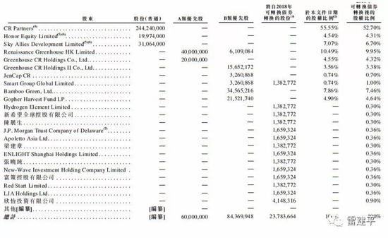 成为资本持股约8%,红杉资本持股约7%,李曙军旗下Greenhouse CR Holdings Co.,Ltd及Greenhouse CR Holdings II Co.,Ltd分别持股4.32%及3.38%,共持股7.7%。