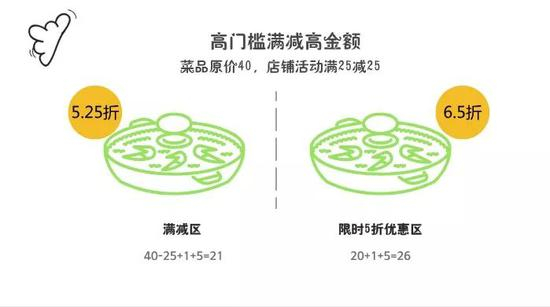 ●满减力度的设计,正确的做法是反向推算。先根据区域内的竞争情况决定满减力度,然后再用成本计算法,反算菜品定价,这样既保证了利润,优惠吸引力也在。
