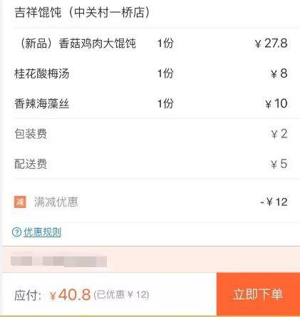 有一天我特别想吃馄饨,在外卖上看中一家“满30减12,满50减22,满60减28”的商铺,心里想着可以18元吃顿馄饨,结果进入店铺后发现馄饨的价格在27~35元之间,最终我点了份鸡肉香菇馄饨(27.8元),一份海藻丝(10元),一杯酸梅汤(8元),满减后加上包装费和配送费共花了40.8元。
