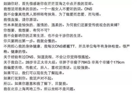 但最近这几年不太一样了,豆瓣除了特定的几个兴趣组,大部分组都变成了“约炮”组,不但平时能看到很多“约一个姑娘一起过夜”的帖子,就连我又一次不小心没写自己性别,也收到了不少类似下面这样的豆油。