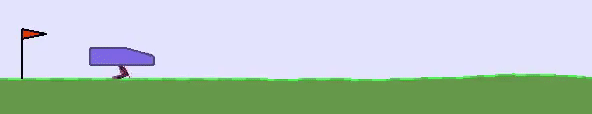 然后,进入绿地场景 (BipedalWalker-v2,基于Box2D,属于Gym) 。这里的智能体是两足的,在“激光雷达”的指引下往前走。