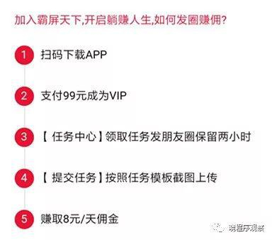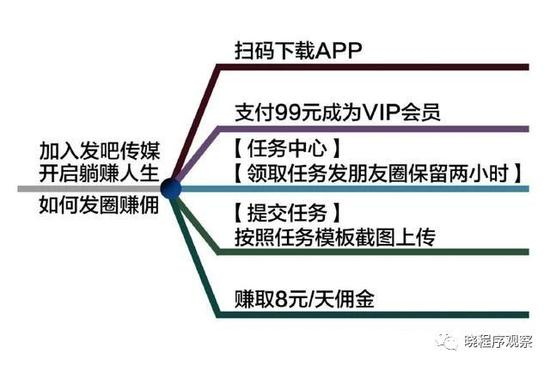 最基本的赚钱流程是:先缴纳99元的会员费成为VIP,领取两个日常任务,内容是发两条含有广告的朋友圈,保持2个小时以上就可以凭借着截图换取8元佣金,提现时平台抽取5%的手续费。