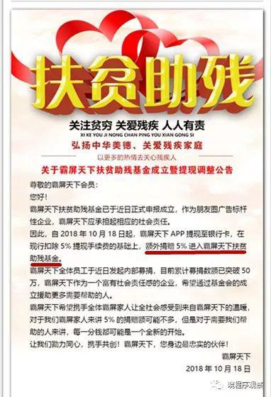 “霸屏天下扶贫助残基金正式成立,自10月18日起,提现至银行卡除了5%的提现手续费,额外捐赠5%费用进入扶贫助残基金。”