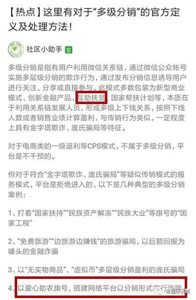 不久前微信官方曾列举了几个“多级分销”的典型案例,其中之一就是打着“扶贫互助”的旗号,建立分销平台。