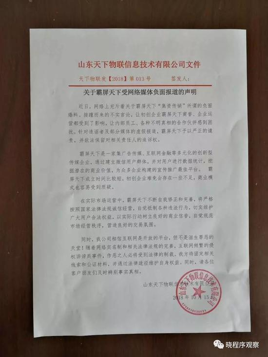 有趣的是,“霸屏天下”的运营主体山东天下物联信息技术有限公司却并不以为然,还针对媒体的报道做了一个言之凿凿的声明: