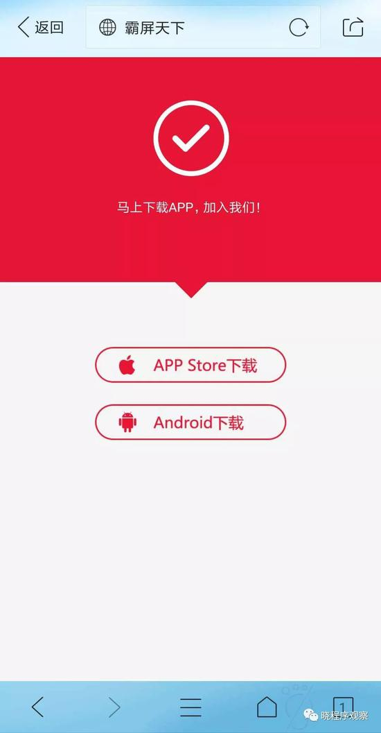 长按扫码后,会提示打开浏览器下载,有趣了,落地页竟不是“应用宝”一类的应用商店,而是单独的下载页?用苹果手机测试后结果也相同。
