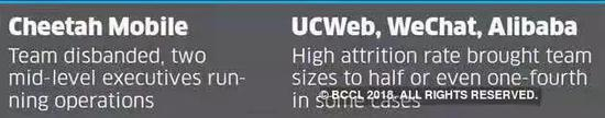 在猎豹移动、微信、阿里巴巴及其部分子公司,类似的人员高流失也在上演。在猎豹移动,高层的动荡甚至已打散了整个团队,而微信、阿里巴巴和UCWeb等公司的团队规模已然减半。