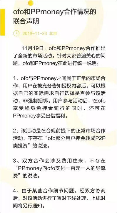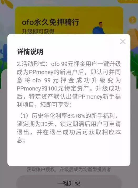随后,PPmoney和ofo发表声明,称这只是一次异业合作尝试,升级并非强制捆绑,并下线了活动。