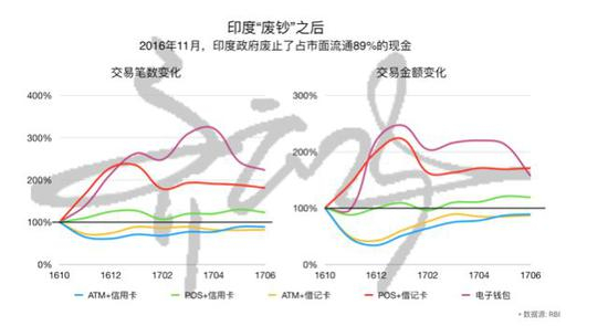 废钞之后,市面上没有现金可用怎么办?莫迪也有对策:推广线上支付。 印度本来就有网银和数十家电子钱包,其中包括阿里投资的“印度支付宝”Paytm。废钞事件后他们都得到了长足的增长。