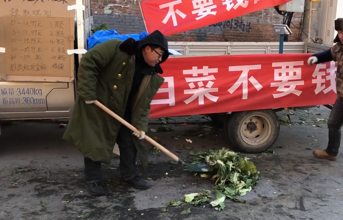 月初,北京某小区门外来了一位有些特殊的商家,他裹着一身绿色军大衣,戴着黑框眼镜,一边高喊“白菜不要钱”,一边井然有序地指挥着围观人群“扫码领白菜”。