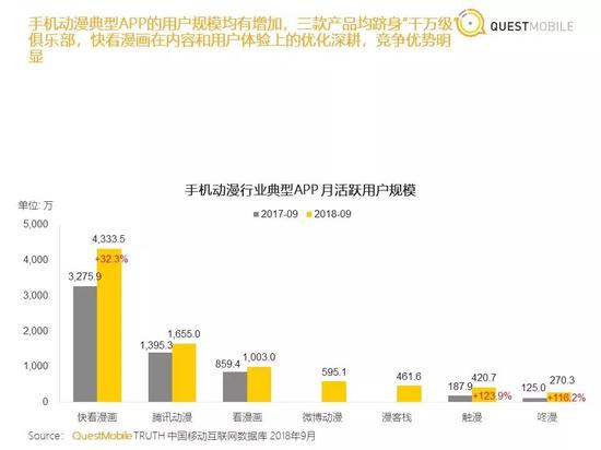 等到下半年,QuestMobile发布《中国移动互联网2018年秋季大报告》时,在快看漫画,腾讯动漫,看漫画,微博动漫均保持较高增速时,网易漫画和有妖气所呈现的颓势已经颇为明显。