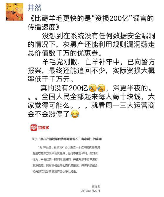 当天下午一点,拼多多发布声明称,有黑伙产团伙通过一个过期的优惠劵漏洞盗取数千万元平台优惠券,进行不正当牟利。同时已向公安机关报案。