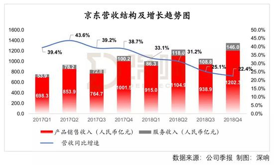而从京东的具体业务来看,京东2018年全年营收总额为4620亿,产品销售收入总额为4161亿元,占比高达90%,其服务收入仅占10%左右。