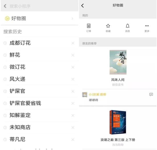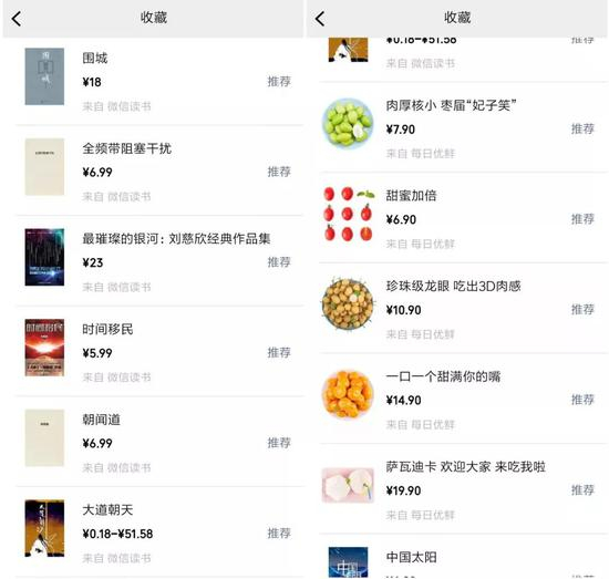 最后,我们还注意到,“好物圈”中部分小程序实现了跟App的数据打通,结果是在App里收藏了商品或下了订单,都会被同步到“好物圈”中,比如每日优鲜、微信读书等等。