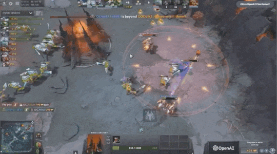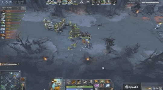 在第一局中,OpenAI前期有略微的劣势,然后开始发力,到第二局几乎就是一直碾压OG。比赛前后期落差太大,不像是职业Dota选手的水平。