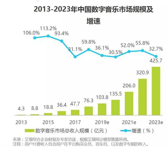 同时,艾瑞咨询发布的《2019年中国数字音乐产业研究报告》中指出:2018年中国数字音乐市场规模为76.3亿元,整体保持着较高的增长趋势,预计在2019年达到103.8亿元的规模,在2023年达到425.7亿元的规模,为2019年的四倍多。
