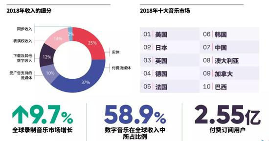 同时,该报告也显示,截至2018年底,全球音乐流媒体付费订阅数量达到2.55亿。该数字意味着,全球今年将有超过4%的人口订阅使用付费音乐服务。而根据IFPI的《2019全球音乐报告》,中国已进入全球十大音乐市场,位列第七。