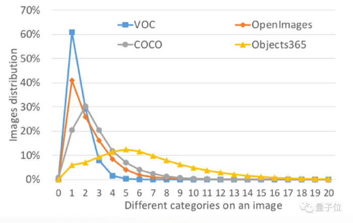 另外,在每张图像覆盖的类别方面,相比此前的数据集,Objects365覆盖类别更广。