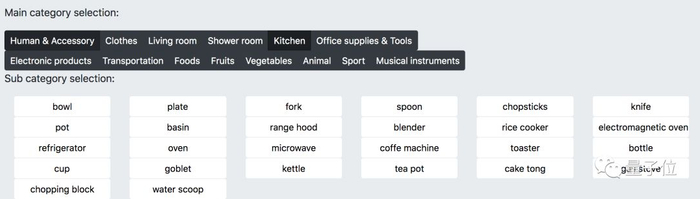 数据集包括人、衣物、居室、浴室、厨房、办公、电器、交通、食物、水果、蔬菜、动物、运动、乐器14个大类,每一类都有数十个小类。