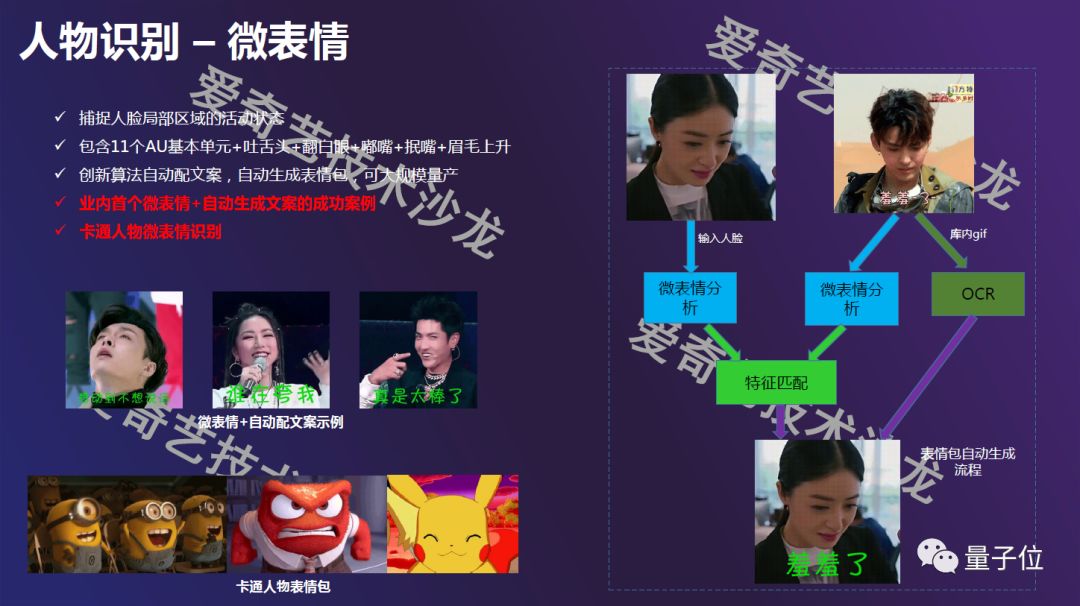 大家都比较熟悉这种表情包,爱奇艺这项技术实现了业内首个表情和文案的自动生成。一个长视频平均能提取出来100多个明星表情包,文案也是自动生成的。除了明星,我们也在做卡通人物相关的实验,可以做到40多个表情包。