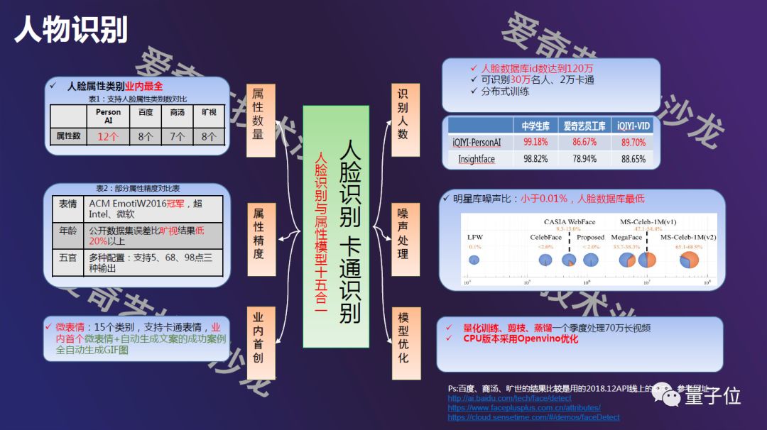 爱奇艺的人物库,包含120万名人,2万虚拟形象(卡通人物)。目前人脸识别精度最高的是ArcFace,可以达到99.8的精度。爱奇艺和ArcFace做过比较,是领先于它的。