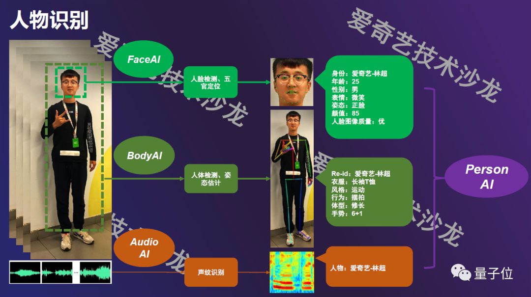 人脸识别可能大家都不陌生,但人物识别并不等同于人脸识别。人物识别除了通过人脸识别,也可以采用其他技术,比如说人体(reID)、声纹等。当然爱奇艺主要是视频资源,针对明星会采用人脸识别,针对动漫等卡通剧,会采用虚拟人物识别。