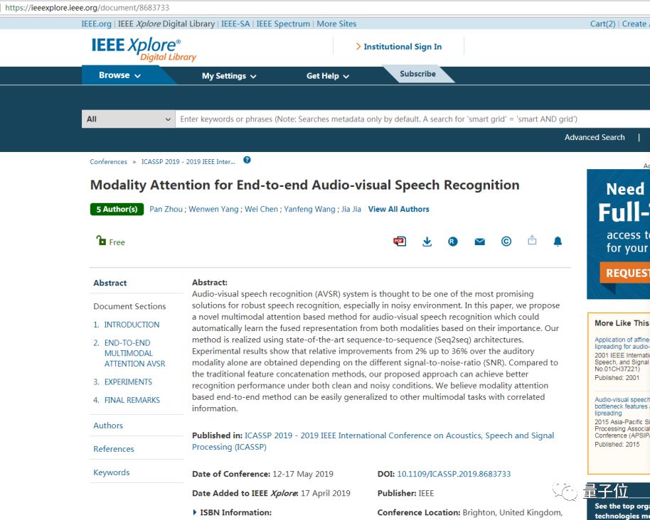 相关论文《基于模态注意力的端到端音视觉语音识别》已经发表在今年的学术会议ICASSP上。