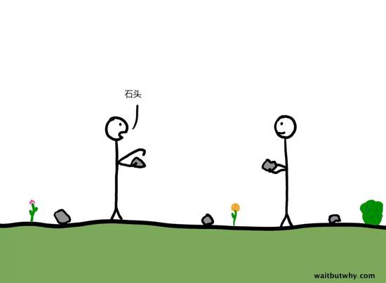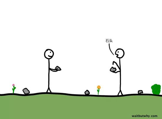 人类的脑已经进化到了能够理解“石头”这两个字的读音虽然不是一块石头,但是可以被用来指代石头——这意味着,人类发明了语言。