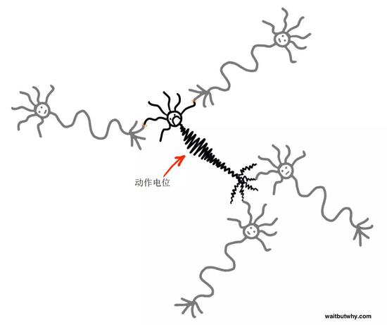 当足够多的神经传递素把小帅的电荷提高过了一个点——阈电位的时候,这时就会产生一个动作电位,而小帅此时就被电击了。