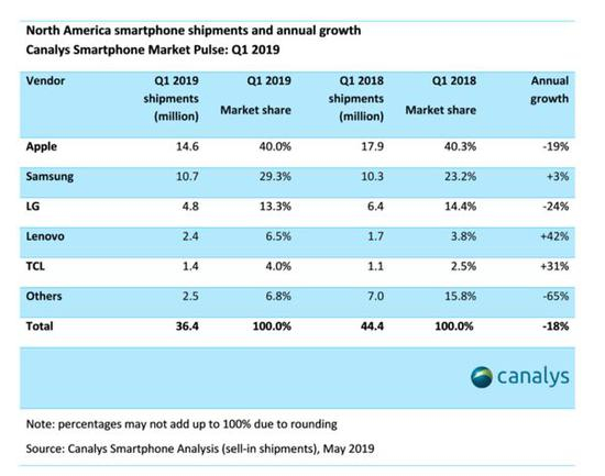 根据第三方调研机构Canalys发布的最新市场调研数据显示:2019年第一季度,北美智能手机总出货量为3640万台,比去年同期的4440万台出货量少了800万台。报告指出,其中主要原因是长期处于北美手机市场销量冠军的苹果手机,出货量大幅下滑。